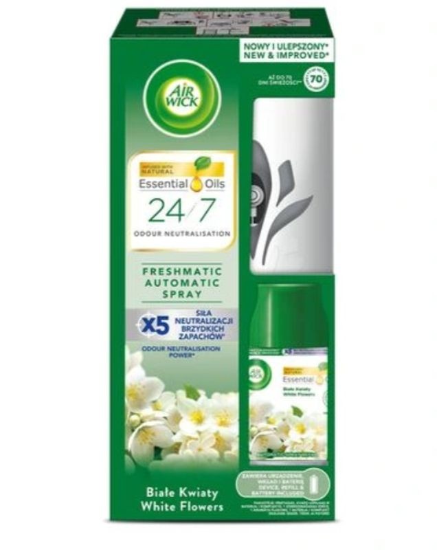 Air Wick Fresh Matic o zapachu białych kwiatów zawiera naturalne olejki eteryczne. Aromat kwiatowych nut zapachowych: lilii, białych róż i jaśminu pomaga wykreować niepowtarzalną atmosferę w każdym pomieszczeniu.Odświeżacz powietrza o właściwościach neutralizujących zapachy. W pomieszczeniach, w których został zastosowany pozostawia przyjemną, długotrwałą perfumowaną nutę zapachową. Air Wick zawiera zwiększone stężenie kompozycji zapachowych.