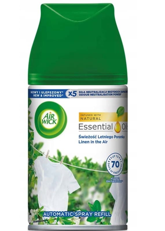 Air Wick Freshmatic - wkład 250 ml to automatyczny odświeżacz powietrza w aerozolu, który nie tylko eliminuje nieprzyjemne zapachy, ale również pozostawia uczucie świeżości. Formuła bez dodatku wody sprawia, że produkt nie osiada na skórze, ubraniach i przedmiotach.