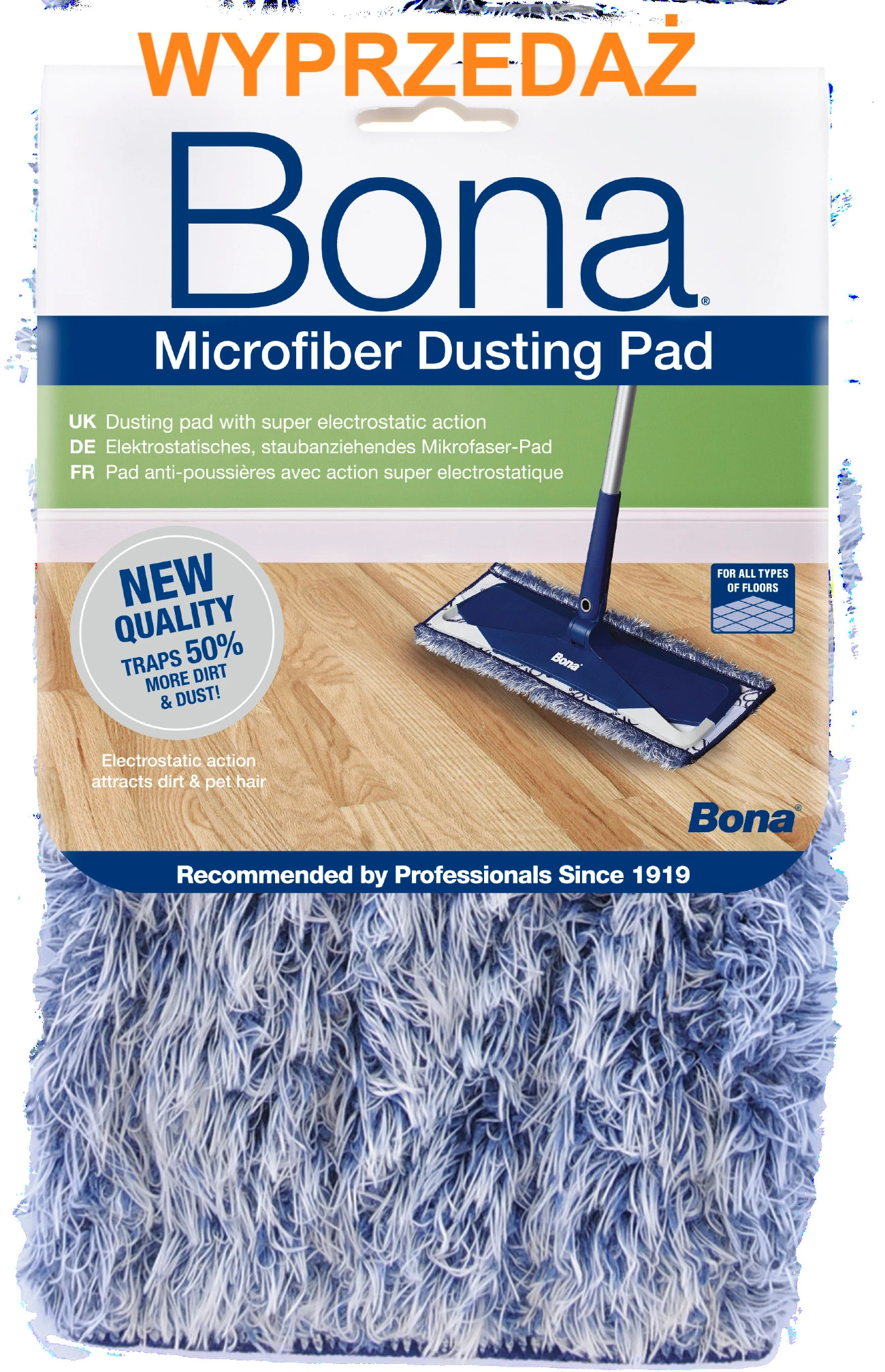 BONA pad odkurzający z mikrofibry wykorzystuje właściwości elektrostatyczne, dzięki czemu zbiera i pochłania kurz, zabrudzenia i sierść.