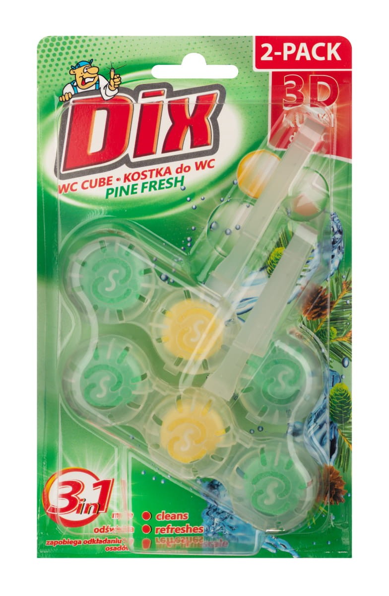 DIX KOSTKA 3D (3w1) do WC skutecznie poprawia czystość i higienę muszli. Neutralizuje nieprzyjemne zapachy oraz doskonale zapobiega odkładaniu się kamienia i osadu.