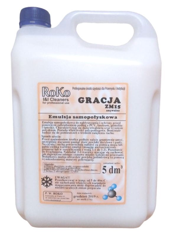 GRACJA ZM15 - emulsja samopołyskowa do podłóg, to wodny roztwór dyspersji akrylowej i woskowej (polimer). Do zabezpieczania wszelkiego rodzaju podłóg z tworzyw sztucznych (PCV, linoleum itp.), lastriko oraz drewnianych lakierowanych.