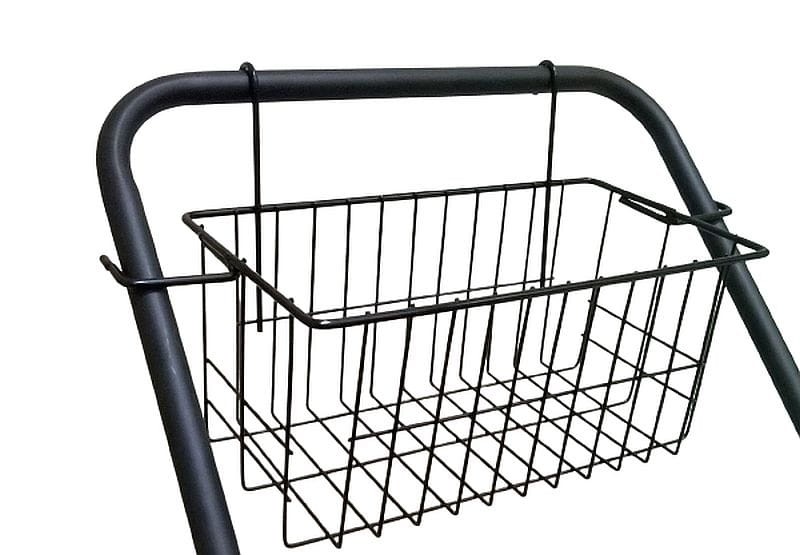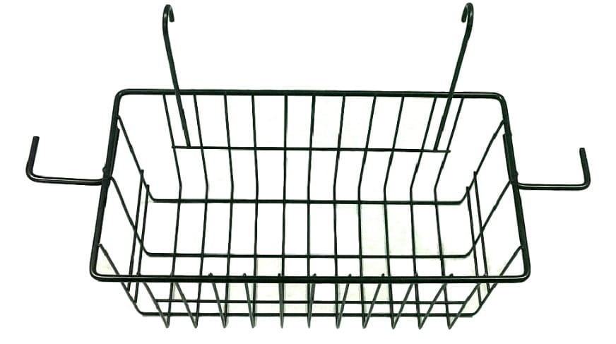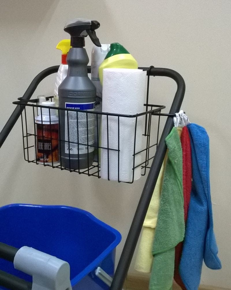 Koszyk do wózka do sprzątania dwu wiaderkowego, przeznaczony na akcesoria, ścierki i płyny do sprzątania. Mocowany na metalowej rączce wózka przy pomocy 2 zaczepów górnych i 2 bocznych. Koszyk malowany jest farbą epoksydową do metalu, zawierającą pigmenty antykorozyjne (długotrwała ochrona przed rdzą).