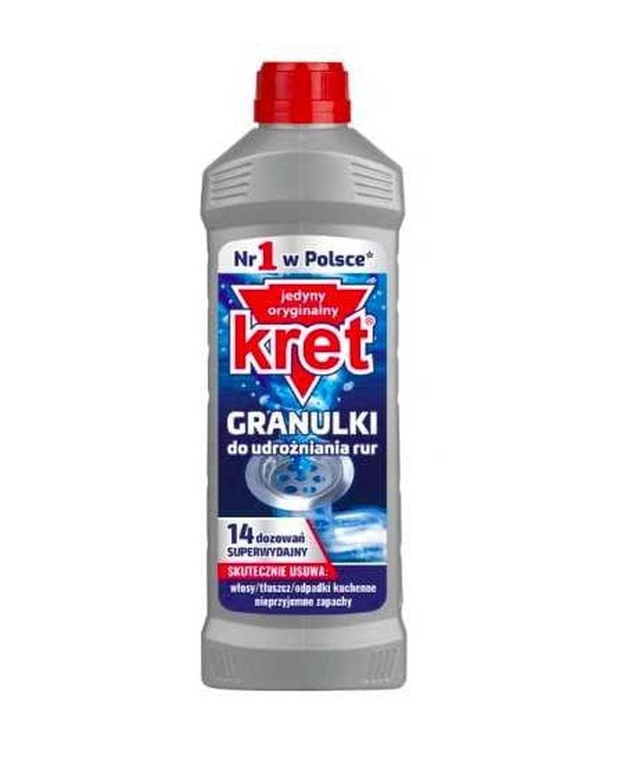 Kret granulki to doskonały środek do chemicznego udrażniania i dezynfekcji rur oraz syfonów w instalacjach kanalizacyjnych. Samoczynnie usuwa wszelkie zanieczyszczenia stałe i organiczne (tłuszcz, włosy, papier, odpadki kuchenne). Likwiduje nieprzyjemny zapach w kanalizacji.