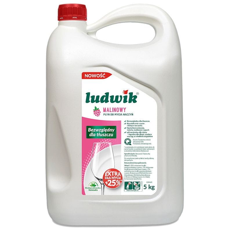 Płyn do mycia naczyń Ludwik posiada bardzo dobre właściwości myjące oraz wysoką zdolność do emulgowania tłuszczów. Przy pomocy Ludwika można myć naczynia zarówno w ciepłej, jak i zimnej wodzie. Płyn nie pozostawia zacieków na umytych powierzchniach, nadaje im połysk bez konieczności wycierania do sucha. Ludwik malinowy posiada pH neutralne dla skóry - łagodny dla dłoni, zawiera wyciąg ze słodkich migdałów.