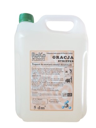 Gracja STRIPPER - alkaliczny płyn do usuwania starych i zniszczonych powłok akrylowych. Polecany przede wszystkim do profesjonalnych zastosowań. Ze względu na zawartość nisko pieniących detergentów można stosować go również w maszynach myjących. Polecany również do mycia silnie zabrudzonych podłóg odpornych na alkalia.
