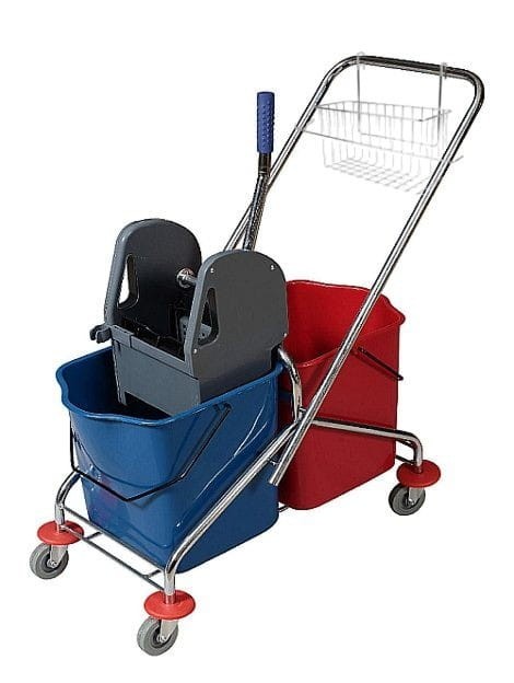 Dwu wiaderkowy wózek do sprzątania o pojemności 25l każde wiadro, z prasą i koszykiem na akcesoria do sprzątania.