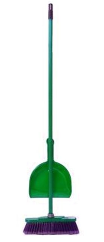 Praktyczny zestaw do zamiatania, w skład którego wchodzi miotła plastikowa z włosiem PCV, kij standardowy aluminiowy z zawieszką, powlekany tworzywem oraz szufelka plastikowa z wyprofilowaną rączką, mocowaną do kija.